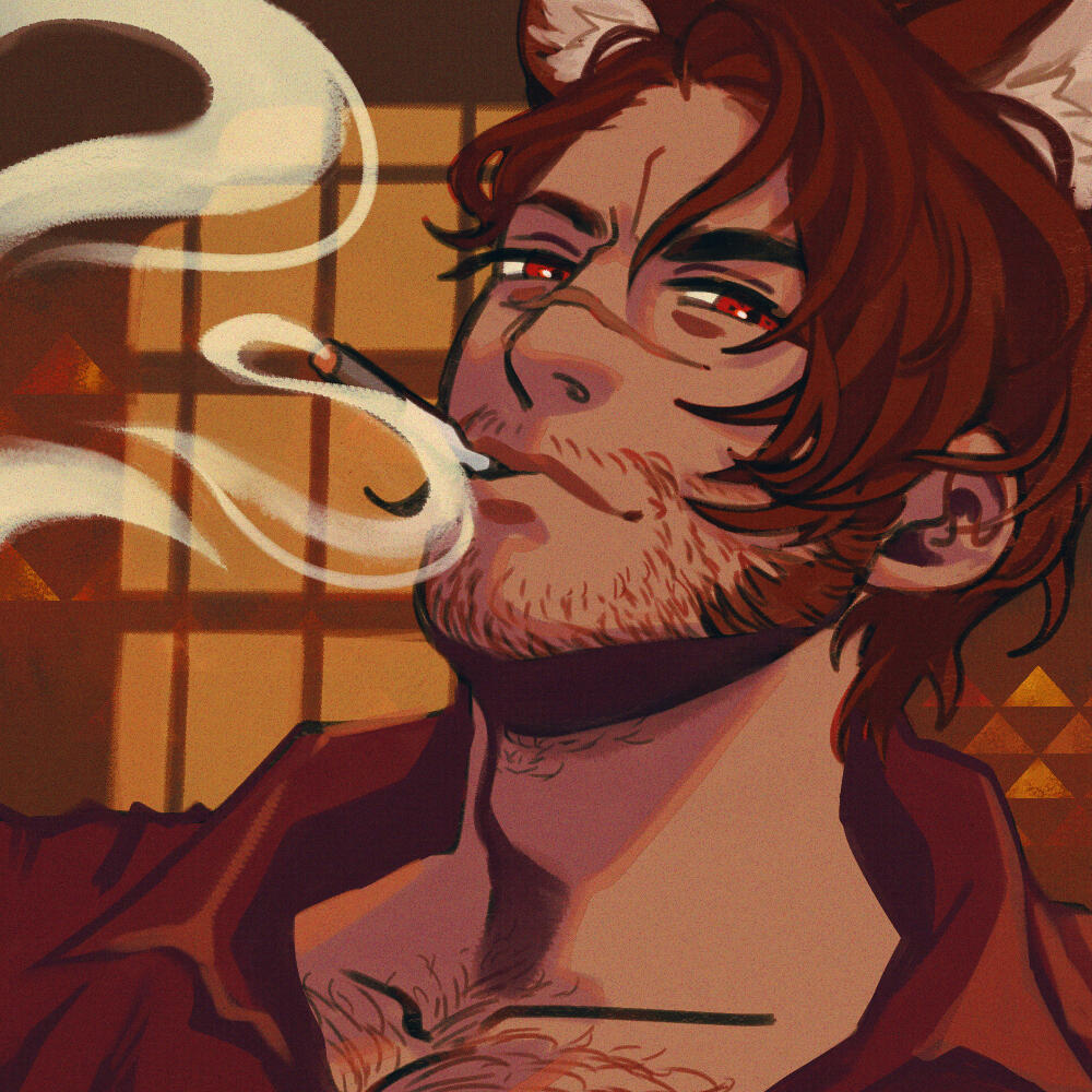 His striking appearance would be his bright red hair, and his crimson-colored eyes. His eyes are almost always fox-like with pupils thinned into slits, mainly masked by the bangs that spill over his face. Though, he does like to gel his hair back a lot of the time. Unlike typical Hyur, he bears fangs and canines that are sharpened. Across his nose is a clear scar from getting a glass bottle bashed across his face by his father in a drunken rage.